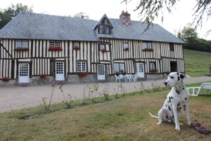 :: change of drinks now, with two properties in the Calvados region of Normandy both located on 10 or so hectares of orchards growing apples and pears, and both with the owners living in homes first built in the 1600s! (And one, Le Lieu Chéri near Lisieux, was complete with a “wine dog” as well, a Dalmatian youngster named, we think, Garayon). In both places they use a process that is hundreds of years old to turn the fruit into juice, cider, Pommeau, or a cognac-like drink named after the region, Calvados. The process includes steps like letting the apples fall to the ground and picking them up from there rather than from the branches, and then juicing the entire fruit all bar one part. The skins, stalks, cores – everything goes in the mix….all except the pips which are definitely excluded as they are too bitter. We tasted all the resulting varieties, and they’re all great, but as there are limits to both our budget, and also the the carrying capacity of the camper, from the first place we only bought some pear cider and a bottle of Pommeau (an aperitif made from 3/4 apple juice, 1/4 Calvados and then left in an oak barrel for 3-4 years without any fermentation….as opposed to the Calvados itself which is fermented juice that has been aged in oak barrels for up to 30 years) and from the second a jar of Confite de Cidre au Calvados, plus a small bag of caramels which taste kind of like Jersey Caramels and are made from their fruit jam and milk. Come to think of it the Channel Islands including Jersey are not far off the coast of Normandy, so there’s probably every good reason why caramels from Normandy should taste like those from Jersey!